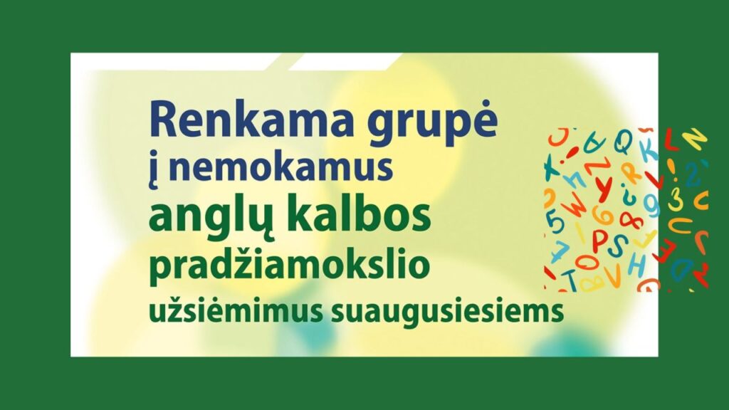 Nuo sausio 17 d. organizuojami nemokami anglų kalbos pradžiamokslio užsiėmimai suaugusiesiems. Bus mokoma anglų kalbos abėcėlės, tarimo, pagrindinių kasdienio gyvenimo frazių, pristatyti save, bendrauti anglų kalba gyvenimiškose situacijose.
