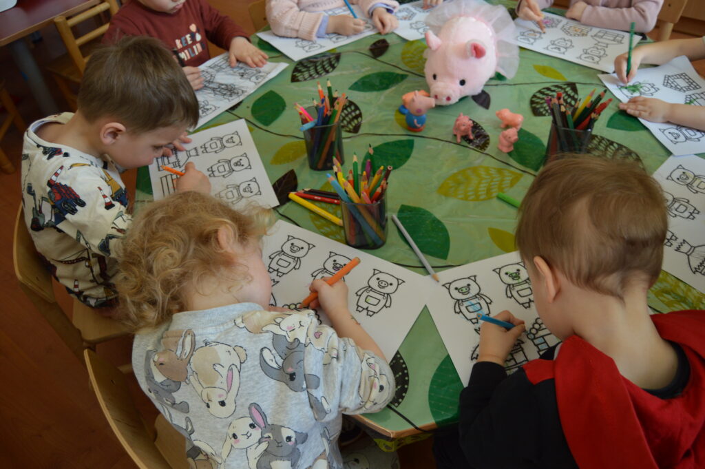 Viešnia aplankė pačius mažiausius – 2–3 metukų „Ežiukų“ grupės vaikus ir jų auklėtojas Ronetą Tamelienę bei Redą Kulišauskienę ir pakvietė kitaip, netradiciškai pasiklausyti ir pamatyti sekamą vieną populiariausių pasakų „Trys paršiukai“, kuri tądien interaktyviai atgijo kamishibai teatre.