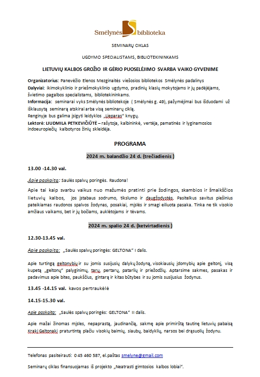 Balandžio 24 d., trečiadienį, 13.00–14.30 val. Smėlynės biblioteka kviečia dalyvauti seminarų ciklo „Lietuvių kalbos grožio ir gėrio puoselėjimo svarba vaiko gyvenime“ pirmajame seminare.