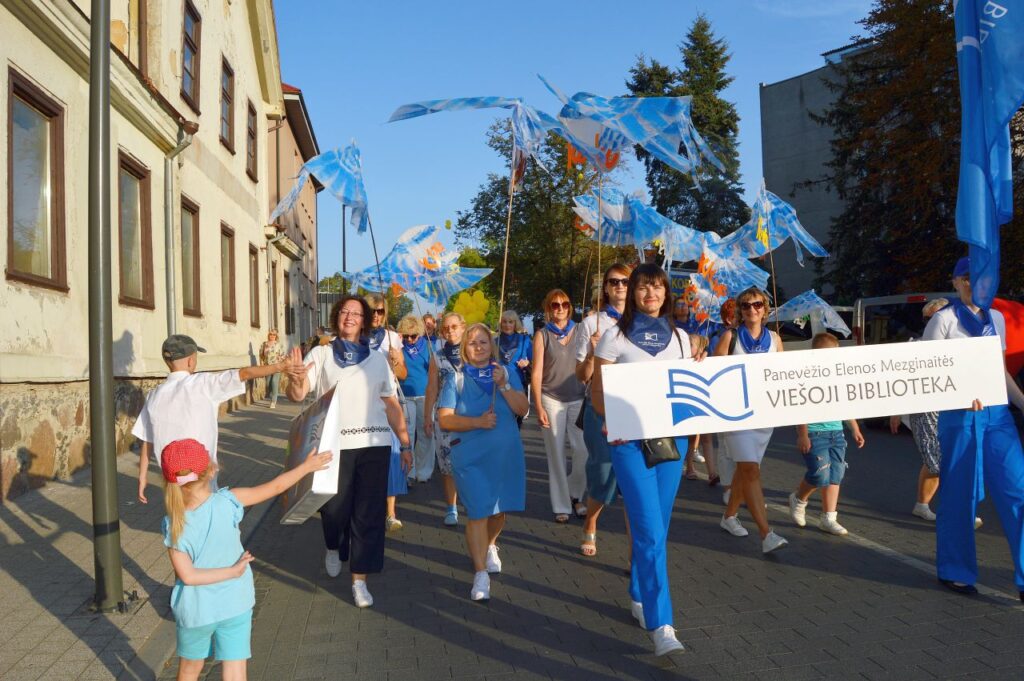 Vakare bibliotekos kolektyvas nepraleido galimybės reprezentuoti savo įstaigą viename gražiausių šventės akcentų – miesto gatvėmis žygiuojančia šventine eisena. Mojuodami stilizuotais ryškiai mėlynais paukščiais, pasipuošę baltai mėlynais rūbais, nešini vėliava ir užrašu, žygiavome į Laisvės aikštę ir stebintiems dovanojome poetės E. Mezginaitės eiles bei gerą nuotaiką.