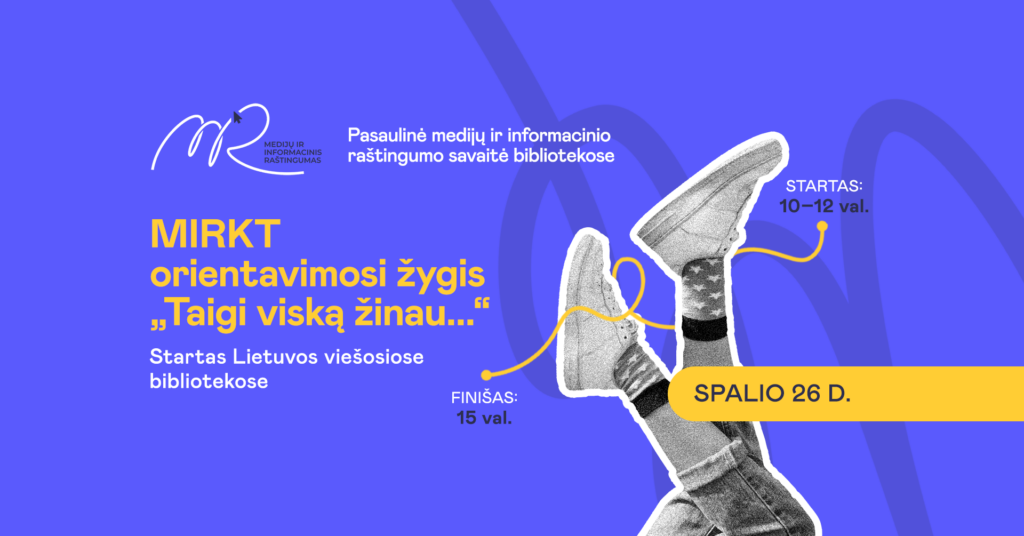 Kviesk draugus, šeimos narius ar smalsius kolegas ir spalio 26 d., šeštadienį, dalyvauk Lietuvos viešųjų bibliotekų organizuojamame masiniame orientaciniame žygyje „Taigi viską žinau…“ apie medijų ir informacinį raštingumą – MIRKT.