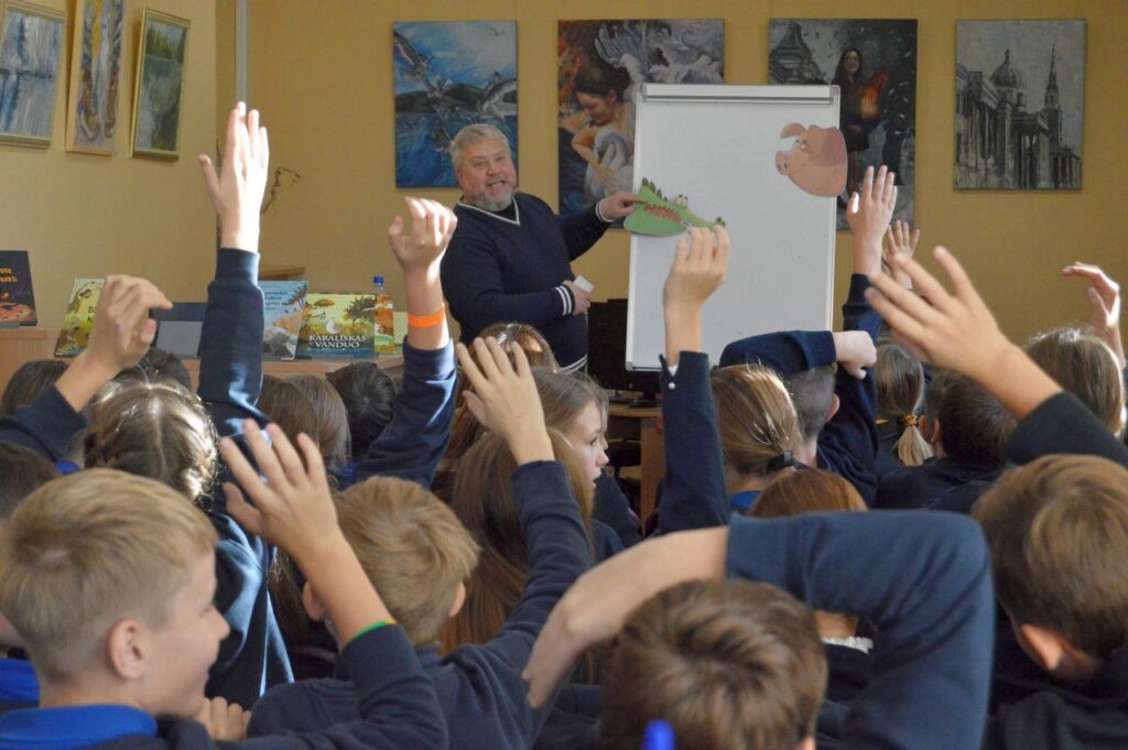 D. Šukys mokiniams papasakojo apie savo pomėgį skaityti, smagią vaikystę, mokyklą, močiutę, kuri skaitė „baisias“ pasakas ir kepė pačius skaniausius blynus.