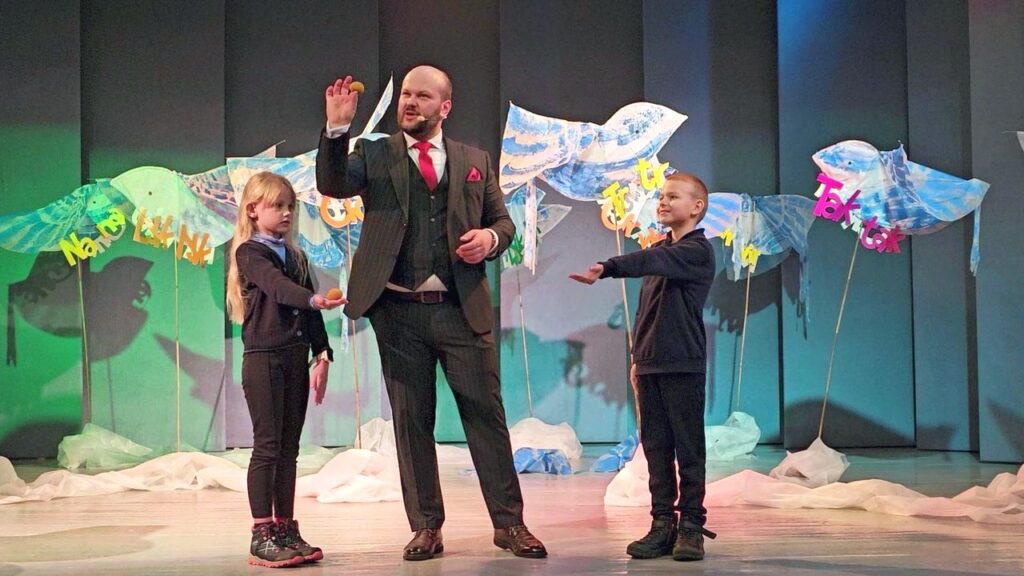 Renginio vedėjas, mergaitė ir berniukas ant scenos dekoracijų fone