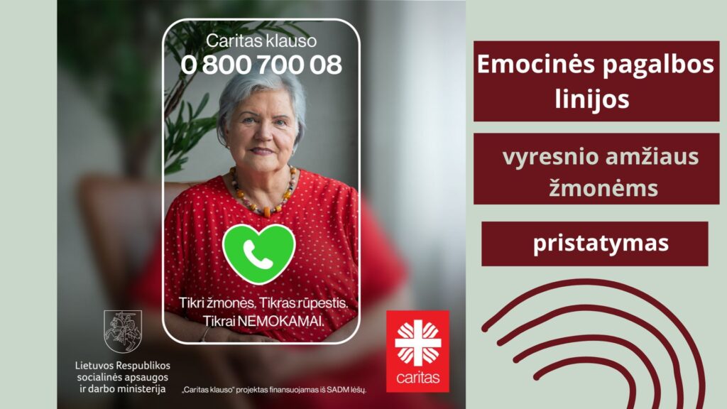 „Caritas klauso“ – emocinės pagalbos linija vyresniems žmonėms. Linijos savanoriai pasirengę skirti dėmesio, padrąsinti bei palaikyti tuos, kurie jaučiasi vieniši ar stokojantys bendravimo.