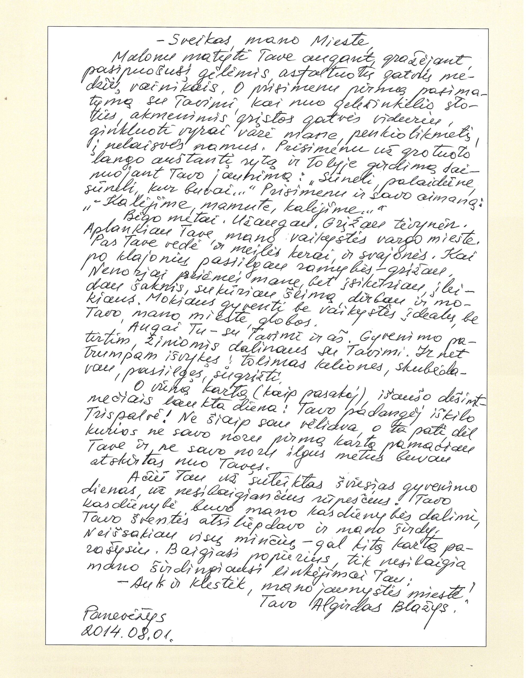 Panevėžys literatūroje „Kiekvienas turime savo miestą, savo pradžios ir pabaigos tašką…“ – rašė Volfas Vitmenas. Tokį miestą turime ir mes panevėžiečiai. Tai mūsų gimtasis Panevėžys, kurį mylime. Keletas laiškų, skirtų Panevėžio miestui. Puslapiai: 1 2 3 4 5 6 7