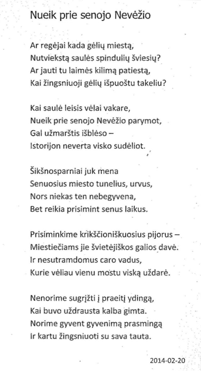 Kairys, Pranas. Nevėžis // Prie vieškelio dulkėto: eilėraščiai. – Panevėžys: Reklamos forma, 2015. – P. 105.